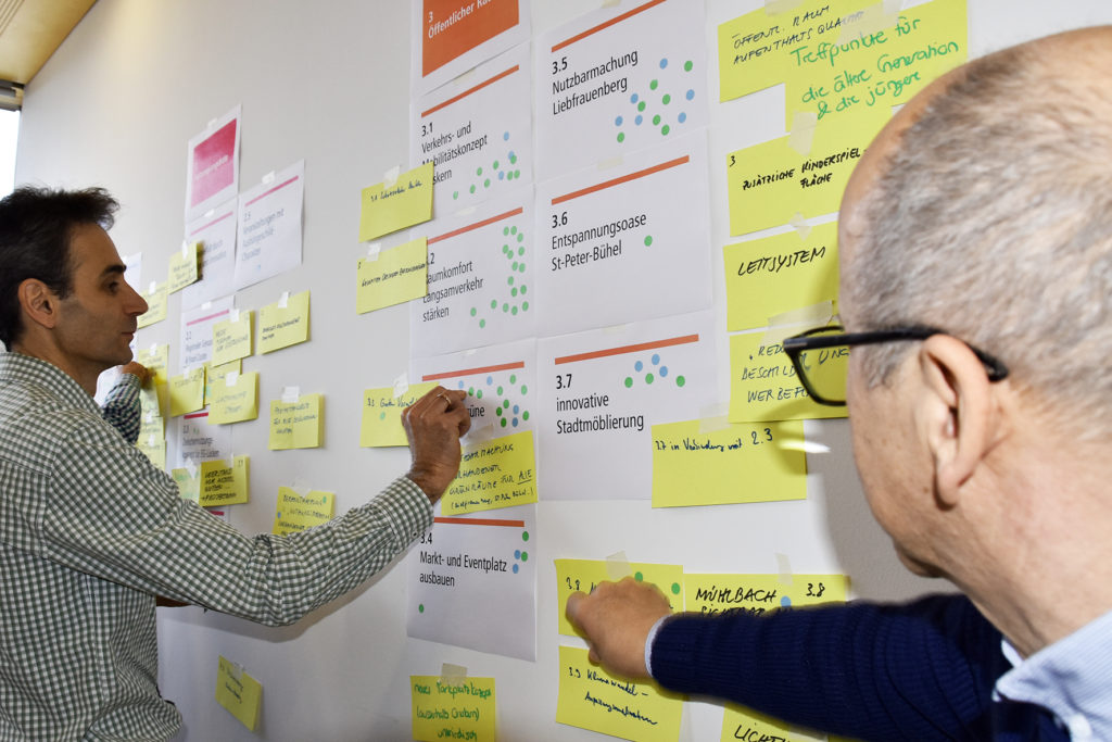 Gearbeitet wurde an sieben moderierten Tischen mit je sechs Personen. Rund 45 Minuten lang hatten die einzelnen Gruppen Zeit, die ihrer Meinung nach größten Stärken und Schwächen der Gemeinde zu nennen. Anschließend stellte Lukas Wahlen von der Intosens AG sechs Zielbereiche vor: Ortskerndefinition, Nutzungsangebote, öffentlicher Raum, Arbeiten und Wohnen, Gemeinschaftssinn und Positionierung. Jeder dieser Zielbereiche umfasste zwischen drei und sieben vorgegebene Unterziele, über welche rund 45 Minuten in den Gruppen diskutiert wurde, bevor die TeilnehmerInnen die für sie wichtigsten Unterziele auswählen und mittels der Vergabe von Klebepunkten öffentlich gewichten konnten.