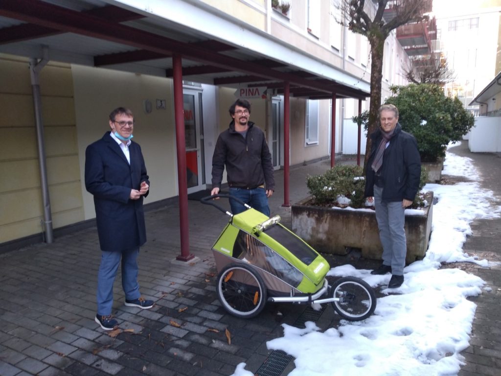 Da wurde das „PINA Unterstützungsnetz für Familien“ aktiv: Kurzerhand wurde ein „Kiki“ aufgetrieben, mit dazugehörigem Fahrrad, das der Familie die Wege wieder rechtzeitig ermöglicht. Am Donnerstag konnten die beiden noch recht jungen Vorstandsmitglieder, Obmann LAbg. Christoph Thoma und Gerold Kornexl, die Fahrzeuge den Betreuern der Familie übergeben.