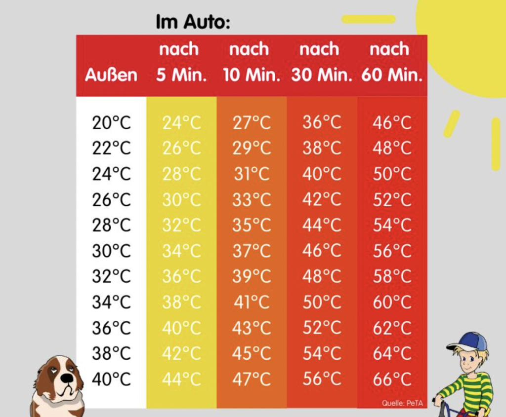• Kindersitze mit Tuch abdecken, da sich der Stoff durch direkte Sonneneinstrahlung stark aufheizt. Bevor das Kind hineingesetzt wird, Temperatur selbst mit der Hand prüfen. Generell sollte man bei extremer Hitze genügend Trinken (zweieinhalb Liter in Form von Wasser, Fruchtsäfte oder Tee), da der Körper durch das Schwitzen viel Flüssigkeit verliert. Auch auf üppige und fettige Speisen sollte verzichtet werden, denn sie belasten den Körper zusätzlich. Oft passiert es auch, dass Kinder oder Haustiere im Auto vergessen werden. In einem solchen Fall ist jede/r dazu verpflichtet, zu helfen. In derartigen Situationen rät der