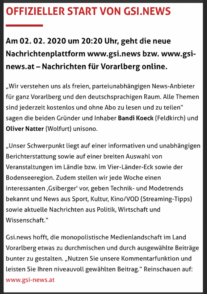 Vorarlbergs Medienlandschaft wird von vielen zurecht als „langweiliges Monopol“ und „Einheitsbrei“ bezeichnet. Dass Bedarf an einem politisch wie religiös völlig unabhängigem, freien und kostenlosem Medium besteht, liegt schon länger auf der Hand. Bandi Koeck und Oliver Natter haben daher mit der Gründung der Gsi.News GmbH den Grundstein für Nachrichten aus Vorarlberg für Vorarlberg gelegt und legen seitdem den Fokus auf Land und Leute, aber auch die damit verbundene Politik und Wirtschaft, auf Kunst und Kultur sowie Vereine und Freizeit. Zudem ist Gsi.News auch präsent in den Sozialen Netzwerken (Facebook, Instagram, Twitter, YouTube und TikTok) und lässt immer wieder mit spannenden Gewinnspielen aufhorchen.