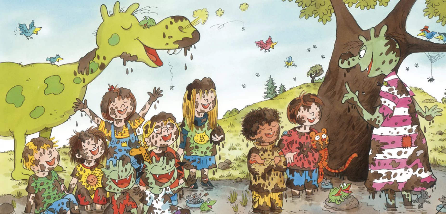 „Schleime-Schlamm-und-Käsefuß!“, rufen die Olchis. „Wir machen ihm ein olchiges Fest!“