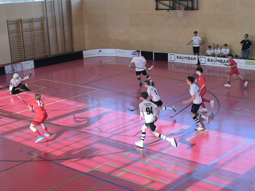 Im zweiten Match des Tages wartete dann der unangefochtene Liga-Dominator VSV, und alles andere als eine hohe Niederlage wäre eine gewaltige Überraschung gewesen. Bis dahin hatten die Villacher bereits 35 Tore gegen Pressbaum, FBC Dragons und TVZ-Wikings erzielt – allesamt Gegner, die eher zur stärkeren Hälfte der Liga zu zählen sind. Der Captain der Kärntner, Elias Kronig, kommt trotz seiner erst 16 Jahre bereits auf sagenhafte 29 IFL-Einsätze (drei Tore) sowie reichlich Erfahrung aus der Finalserie um die österreichische Staatsmeisterschaft. Doch dank einer tollen Abwehr und eines starken Elias Himmer im Feldkircher Tor gelang den Knights als erstem Team in dieser Saison, den haushohen Favoriten weitgehend zu kontrollieren und bis zum Schlusspfiff bei nur sechs Treffern zu halten. Dabei ging die Mannschaft allerdings bis an ihre Grenzen. Joel Himmer sah sein Team bei „nur noch 20 Prozent“, also quasi tiefentleertem Akku, wie er im Interview nach dem Abpfiff entsprechend ausgepumpt zu Protokoll gab. Die Mannschaft konnte nach diesen starken Auftritten trotz zweier Niederlagen zufrieden die Heimreise antreten. Und einer strahlte ganz besonders: Nico Voit kam zu seinen ersten Einsätzen überhaupt in der ÖFBV Jugendliga, nachdem er in den letzten beiden Jahren zwar jeweils Mitglied des U16-Kaders gewesen war, aber ohne Einsatz blieb. Herzlichen Glückwunsch zum verdienten Debüt!