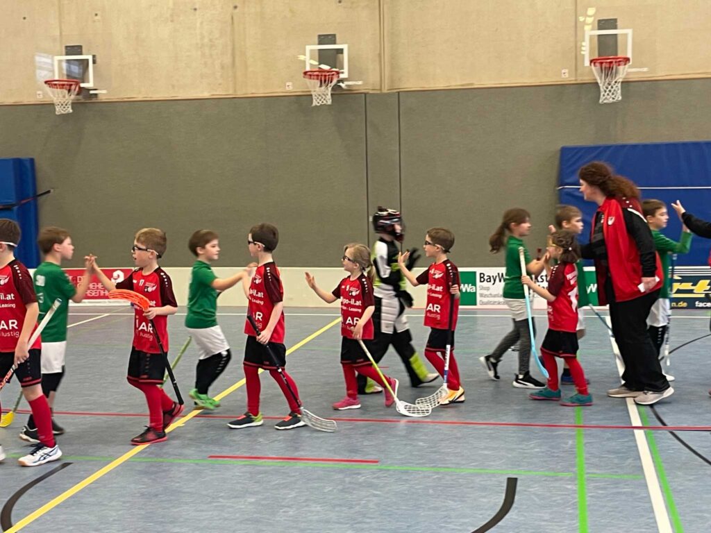 Die Jüngsten durften, wie üblich, den Anfang machen. Die U9 der Knights hatte neben einigen schon recht erfahrenen Spielern – trotz der Bezeichnung Schüler-Cup – mit Sophie und Charlotte auch zwei kleine Mädchen im Team, die noch den Kindergarten besuchen. Das Aufeinandertreffen mit den Großen in der gewaltigen Halle machte zunächst ordentlich Eindruck, doch mit zunehmender Spieldauer schwand die Nervosität schließlich einer lang anhaltenden Begeisterung. Dass dann auch noch das Auftaktspiel gegen Dietmanns gewonnen wurde, war dann noch das Tüpfelchen auf dem „i“. Und auch wenn sich die Red Hocks Kaufering (Teilnehmer an der Top-5-Endrunde der Bayerischen U9-Meisterschaft) als zu stark erwiesen und das Finale mit ihren beiden Teams unter sich ausmachten, gelang der jungen Feldkircher Mannschaft ein toller dritter Platz nach einem spannenden Penaltyschießen. Gegner war hier erneut der SV Dietmanns.