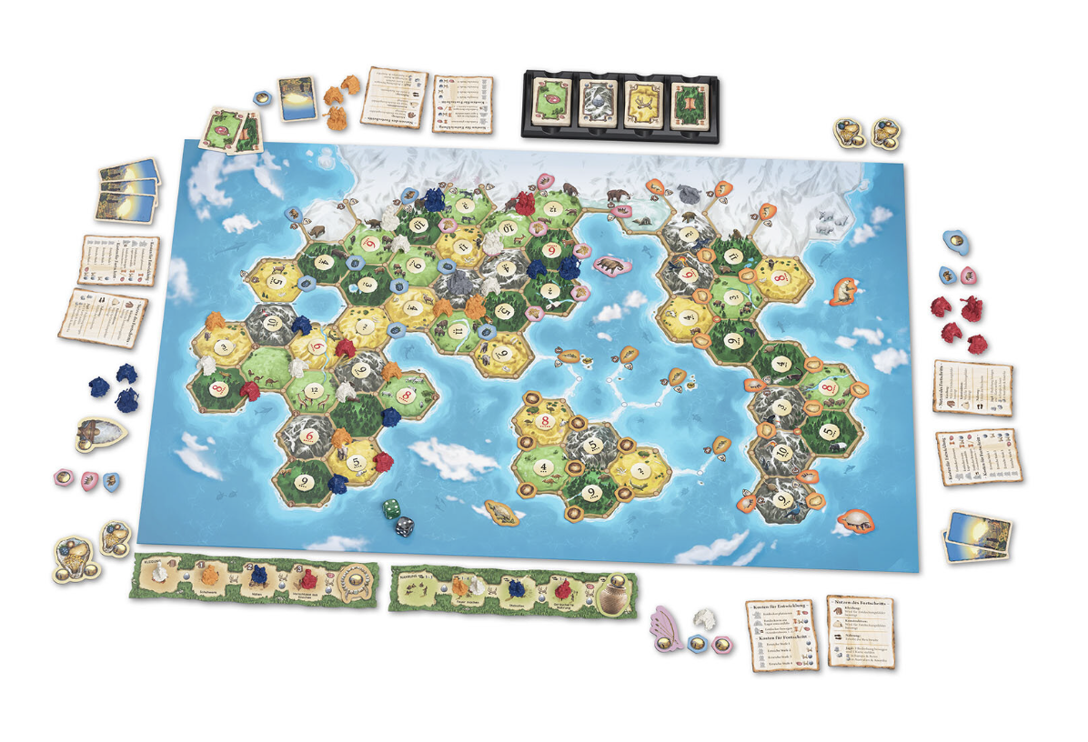 Neben den klassischen Catan-Ressourcen wie Holz, Lehm, Getreide und Erz kommen neue Elemente wie Knochen und Fell hinzu – passend zur Frühzeit. Diese werden unterschiedlich häufig produziert und beeinflussen Handelsstrategien. - Thematische Ereignisse
