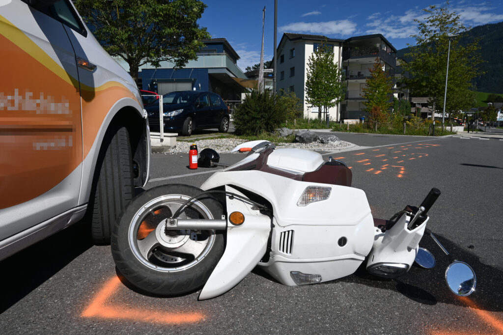 Der Mann fuhr gegen 15:00 Uhr mit seinem Motorrad auf der Dr. Albert-Schädler-Strasse in Eschen, als eine Frau mit ihrem Personenwagen nach links in eine Tiefgarageneinfahrt einbiegen wollte. Der Zweiradfahrer leitete umgehend eine Vollbremsung ein. Er verlor jedoch die Kontrolle über sein Fahrzeug, stürzte und rutschte gegen das stehende Auto der Frau. Der Verletzte wurde durch den Rettungsdienst ins Spital gebracht.