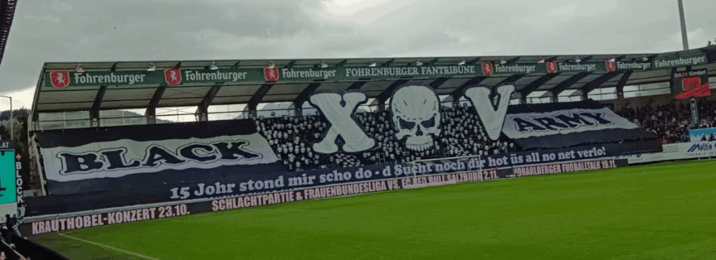 Sonntag 14.30 – 6.500 Zuschauer in Altach – super tolle Choreo der Fangruppen – seit 15 Jahren stehen die Jungs auf der Süd – früher im Regen, heute zum Glück unter einem Dach – jedenfalls immer mit ganzem Herzen “hinter der Mannschaft” – das MAG ich am Fußball. Vollgefüllt ist unser Stadion ein richtiges Schmuckstück geworden.