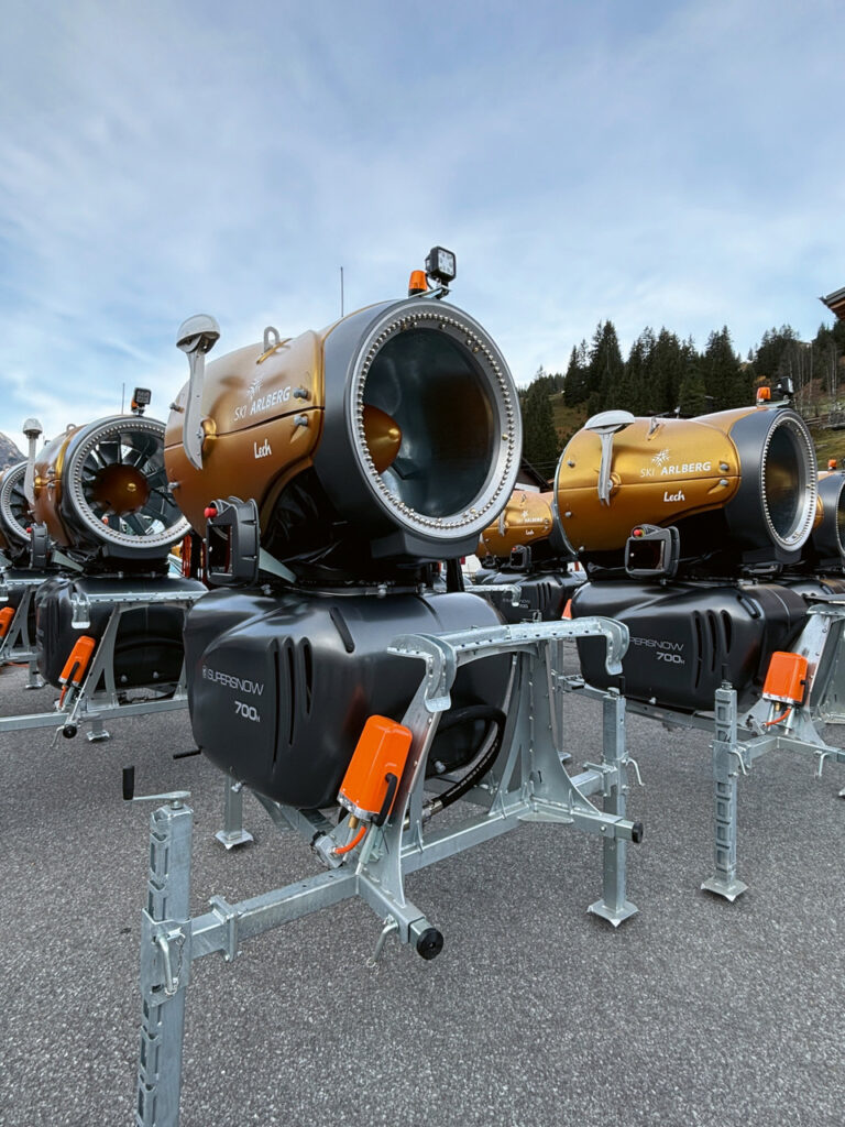Dank dieser Maßnahmen konnte die Effizienz der Beschneiung fast verdoppelt werden, womit nicht nur schneller, sondern auch energiesparender Schnee erzeugt werden kann. Die Wasserentnahme aus dem Lech wurde um ca. 40 Prozent auf 400 Liter pro Sekunde ausgebaut – mit der neuen Pumpstation erhöht sich die Leistungsfähigkeit um insgesamt 100 Prozent. „Die Entnahme beschränkt sich auf einen Zeitraum von drei bis vier Wochen. Mit der Schneeschmelze gelangt das Wasser wieder in den Wasserkreislauf zurück“, erklärt Helmut Gritsch, Leiter Beschneiung der Lech Bergbahnen AG, und ergänzt: „Gleichzeitig werden Teile des Leitungsnetzes modernisiert und frostsicher verlegt. Das hat den Vorteil, dass die Leitungen nach dem Beschneien nicht mehr entleert werden müssen.“ Zudem sind 48 neue Schneeerzeuger im goldenen Lech-Design von den Firmen SuperSnow und DemacLenko geliefert worden und einsatzbereit. Diese moderne Generation arbeitet mit rund 30 Prozent weniger Energie. Bereits im nächsten Sommer werden weitere Abschnitte erneuert und damit wird die Leistungsfähigkeit erhöht.