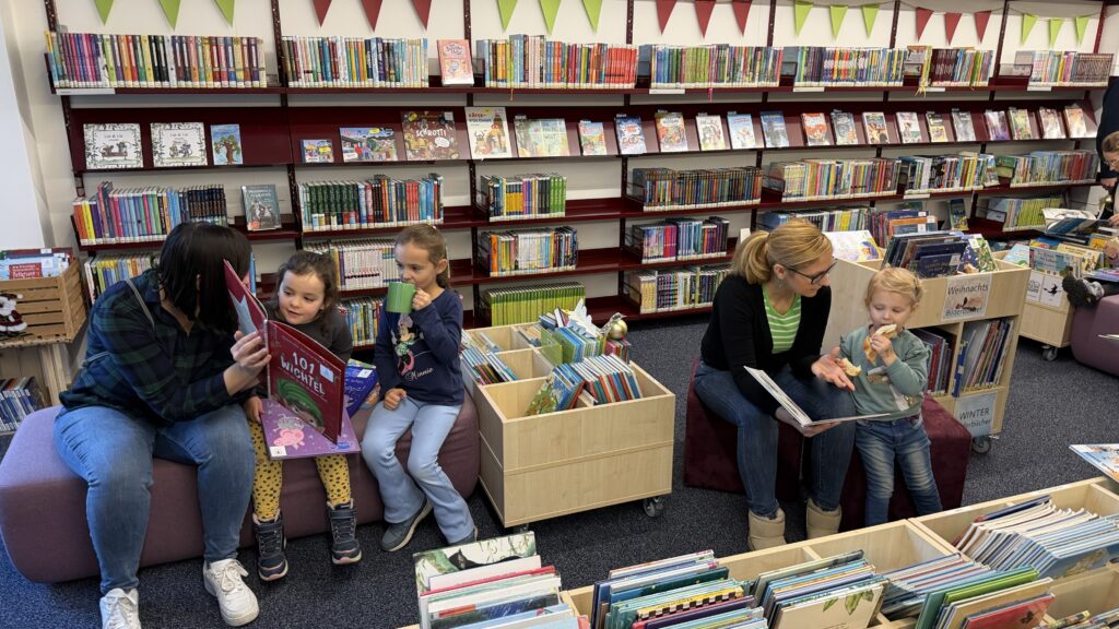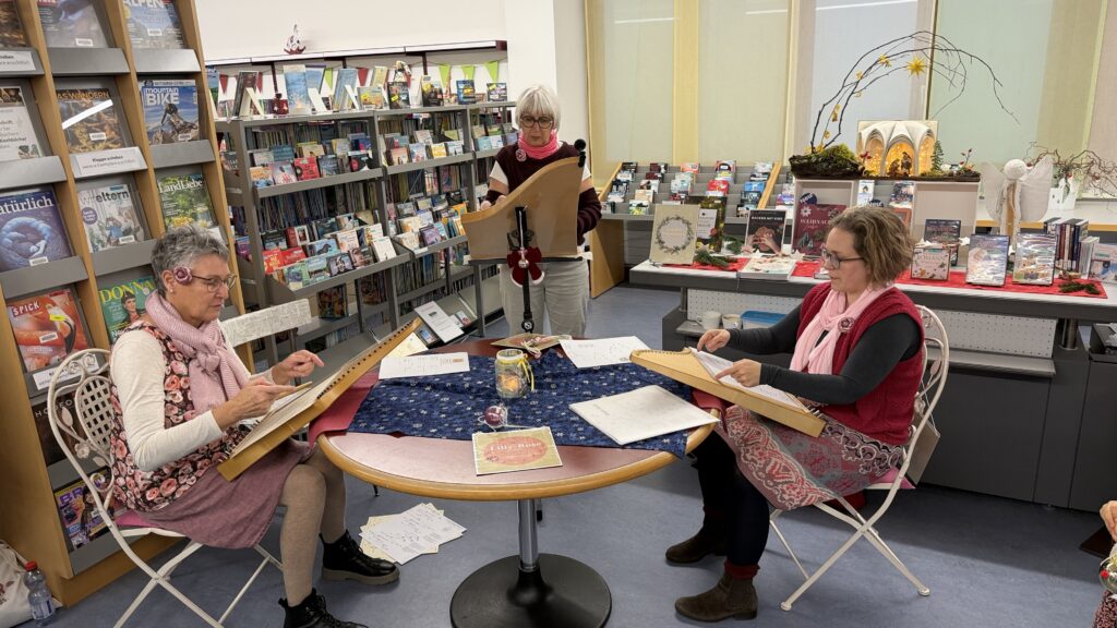 Ein besonderes Highlight war die musikalische Umrahmung: Drei Damen spielten klassische weihnachtliche Melodien auf der Zither – darunter „Leise rieselt der Schnee“ –, was die Bibliothek in einen liebevoll klingenden Adventsraum verwandelte. Eine erzählte Weihnachtsgeschichte sorgte zusätzlich für glänzende Kinderaugen und weihnachtliche Vorfreude.
