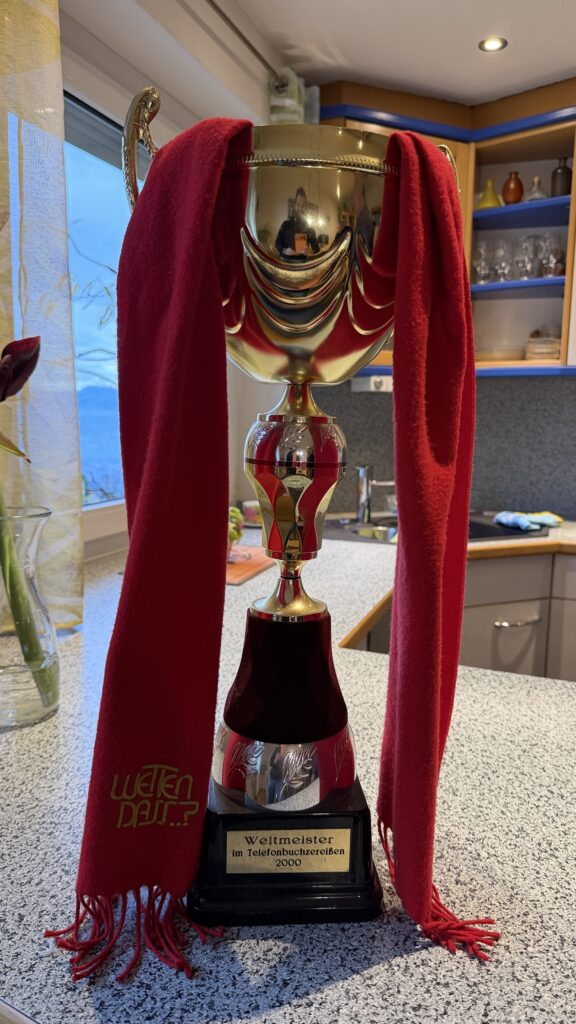 Dabei fing alles ganz unspektakulär an: In Dornbirn organisierte Wilfried jahrelang einen eigenwilligen Fünfkampf mit Disziplinen, die heute vermutlich in jedem Arbeitsschutzhandbuch unter „bitte niemals nachmachen“ aufscheinen würden. Da wurde mit Mittelfingern gezogen, am Boden mit dem Hals gestoßen und die Fäuste quer über Tische geschoben. Kraft war Wilfried also nicht fremd – aber Telefonbücher? Die hatte er bis dahin nicht einmal zerrissen gesehen.