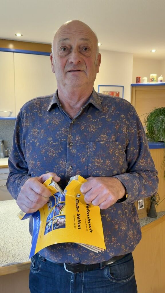 Wenn man heute in Dornbirn-Watzenegg den Namen Wilfried Kohler erwähnt, beginnen die Leute zu schmunzeln, zu staunen – oder beides. Denn dieser Mann, Jahrgang 1952, ist etwas wie eine lebende Sage: der Telefonbuchzerreißer, der am 5. Dezember 1995 im fernen Rostock auf der Bühne von Wetten, dass..??? bei Thomas Gottschalk die Alpenrepublik und die Millionen Zuschauer vor den Fernsehgeräten in Staunen versetzte. Und das mit einem Objekt, das in den 90ern noch zu den härtesten Dingen im Haushalt gehörte – dem Telefonbuch.