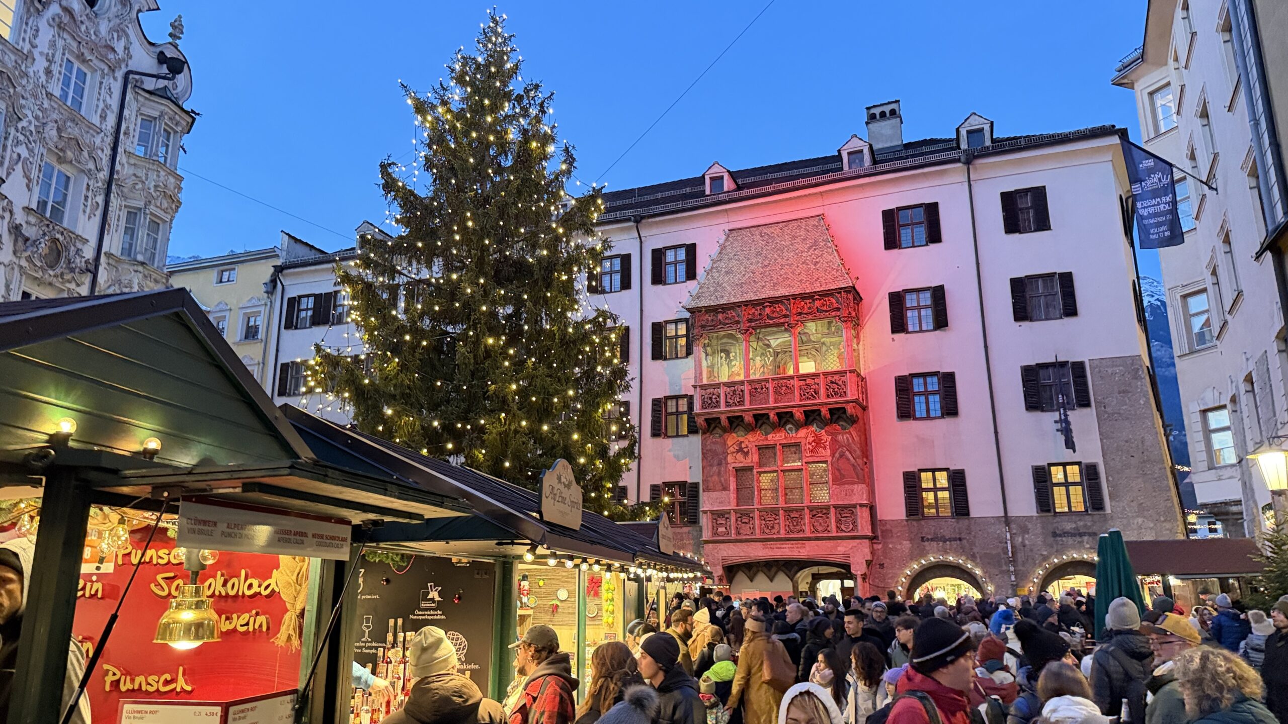 In der historischen Altstadt — rund um das ikonische Goldenes Dachl — reiht sich ein traditioneller Weihnachtsmarkt an den nächsten: Holzbuden, Kunsthandwerk, handgemachte Geschenke, Christbaumschmuck, wärmende Wollwaren und typisches Weihnachtsgebäck.