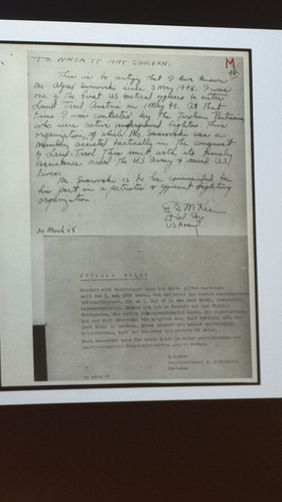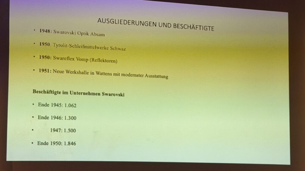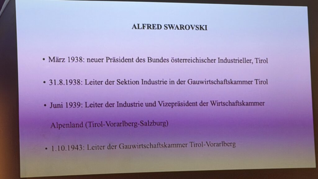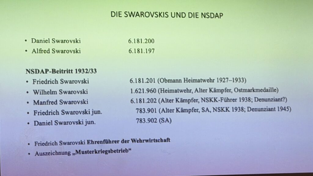 - Eine weitere Folie trug die Überschrift „Die Swarovskis und die NSDAP“ und listete mehrere Familienmitglieder mit NSDAP-Mitgliedsnummern (Anm.: die 6.000.000-Nummern zeigen jene NS-Parteimitglieder, welche während der „illegalen Zeit“ bereits der damals verbotenen Partei beigetreten sind), Funktionen in SA, NSKK und Heimatwehr sowie Auszeichnungen wie den Status als „Alter Kämpfer“. Auch Ehrentitel wie „Ehrenführer der Wehrwirtschaft“ und die Auszeichnung als „Musterkriegsbetrieb“ wurden dokumentiert. Die Dichte und Deutlichkeit dieser Angaben ließ wenig Raum für Relativierungen.