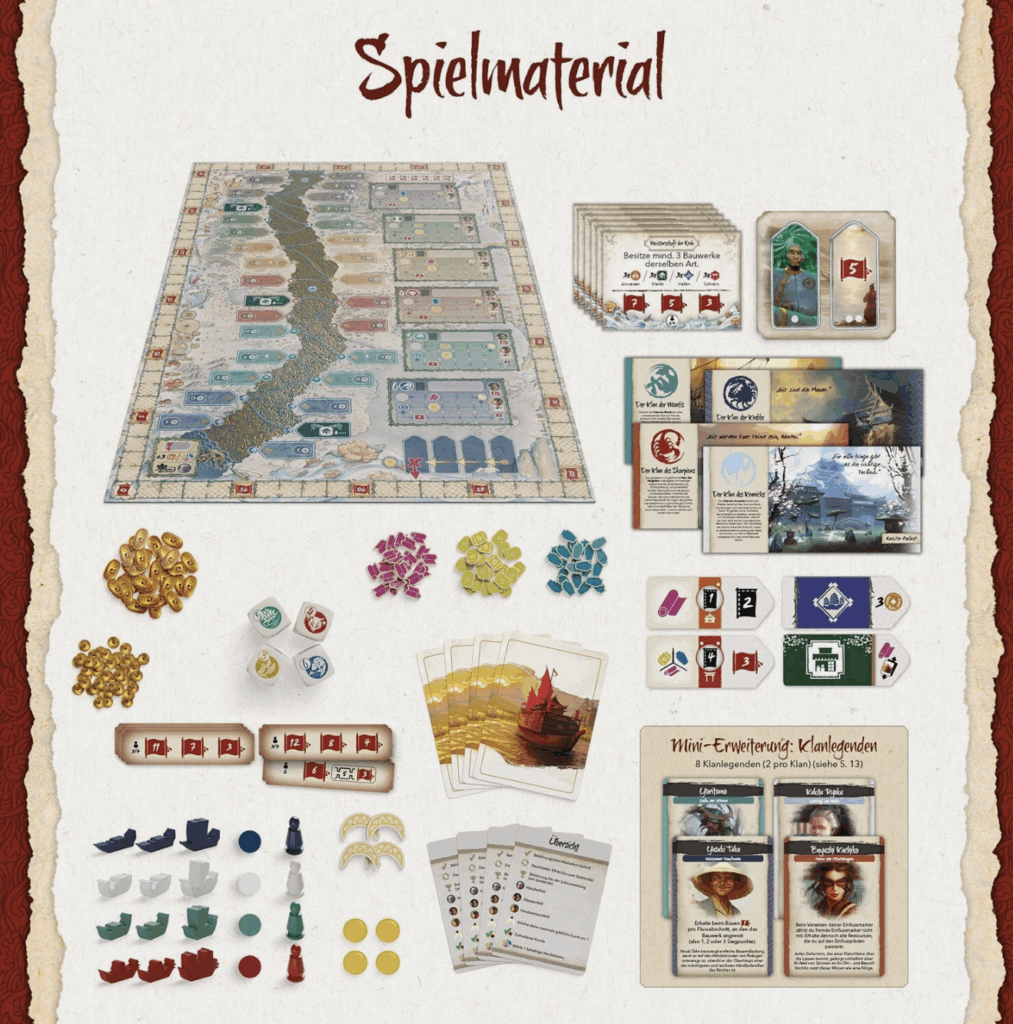 Material: Spielplan mit Goldprägung, Holzschiffe, Waren‑ und Bauwerksteile, Würfel, Marker, Mini‑Erweiterung