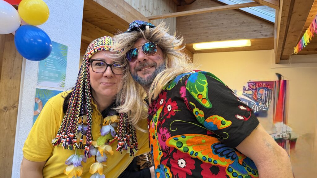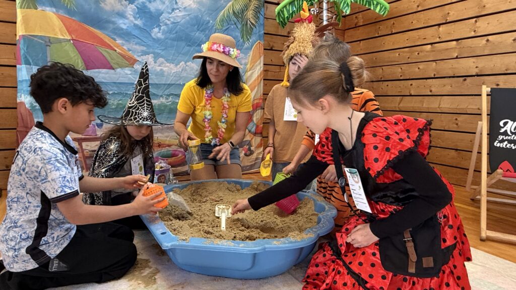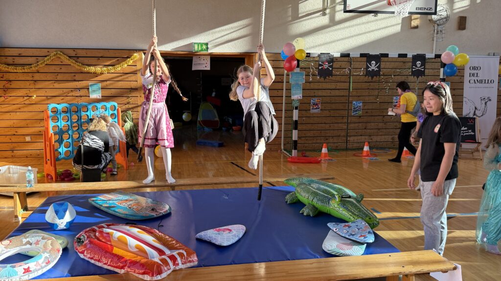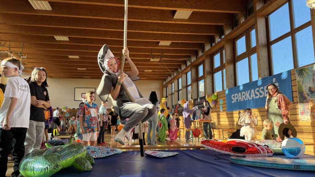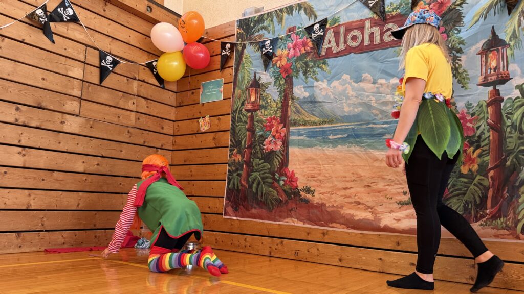 Herzstück der Veranstaltung waren die vielfältigen Spielestationen, die auf dem liebevoll gestalteten Spielepass festgehalten wurden. Bei der Station „Buddelei“ war Geschicklichkeit beim Suchen in Sand gefragt, während „SOS am Strand“ Teamgeist und schnelle Reaktionen förderte. „Wellenreiter“ brachte Bewegung ins Spiel und sorgte für viel Gelächter. Knobelig wurde es beim „Cocktail-Code“, wo Denken und Kombinieren im Vordergrund standen. Kreativ und rhythmisch ging es bei „Strandvibes“ zu, während „Haiattacke“ Mut, Reaktion und Beweglichkeit verlangte. Besonders fantasievoll war „Wo ist die Kokosnuss“ (der Spieleklassiker „Blinde Kuh“) eine Station, die Suchen, Beobachten und Ausdauer kombinierte. Bei „Plitsch Platsch“ stand der spielerische Umgang mit Wasser und Bewegung im Mittelpunkt, „Schatzkiste“ weckte Abenteuerlust, und „Watschel-Spaß“ sorgte mit lustigen Bewegungsaufgaben in Taucherflossen und dem Befördern eines Eis auf einem Löffel für viele lachende Gesichter (und durch die Halle rollende Plastikeier).