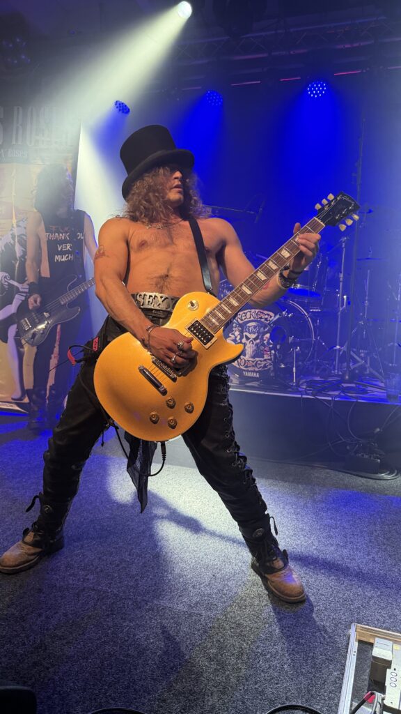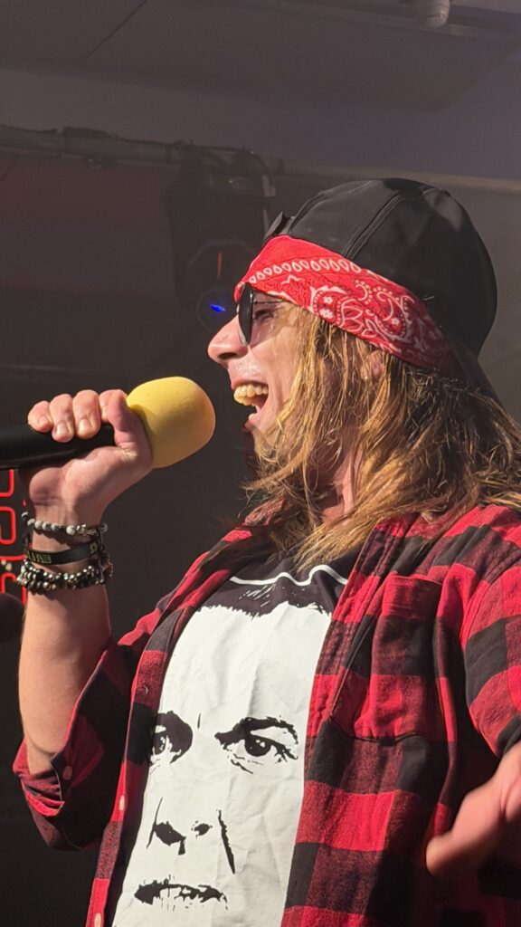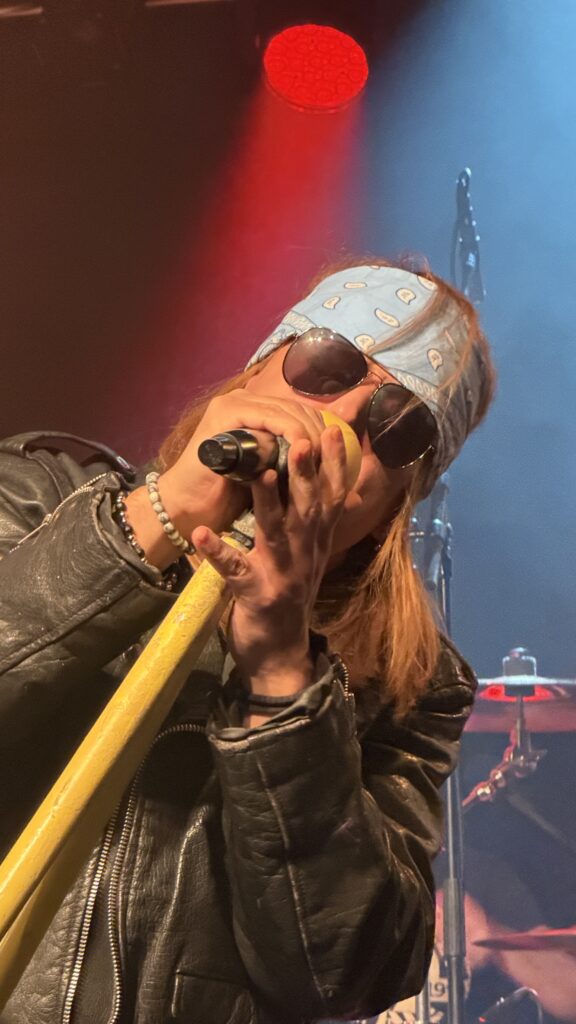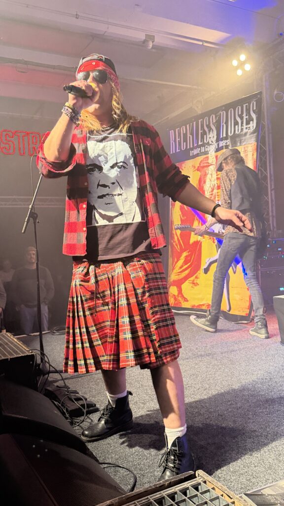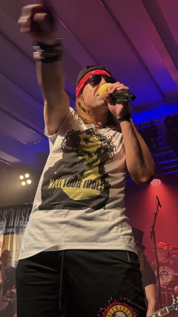 Ein ganz besonderer Reiz dieses Abends lag in der außergewöhnlichen Bühnenpräsenz der Musiker. Besonders der Sänger – ein junger Look-alike von Axl W. Rose – war eine echte Sensation. Nicht nur stimmlich überzeugend, sondern auch optisch bemerkenswert nah am Original, inklusive originalgetreuer Kleidung, die passend zu den Songs gewechselt wurde. Mal im rot-schwarz karierten Schottenrock, mal im ikonischen „Kill Your Idols“-T-Shirt – jeder Auftritt wirkte bis ins Detail durchdacht und mit viel Liebe zur Vorlage inszeniert.