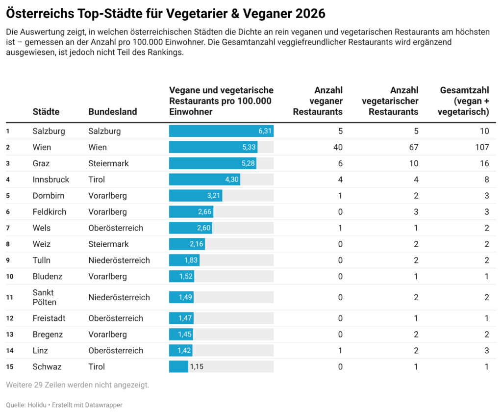 Untersucht wurde, in welchen österreichischen Städten das Angebot an rein veganen und vegetarischen Restaurants im Verhältnis zur Einwohnerzahl am größten ist. Die Datenerhebung erfolgte im Februar 2026.