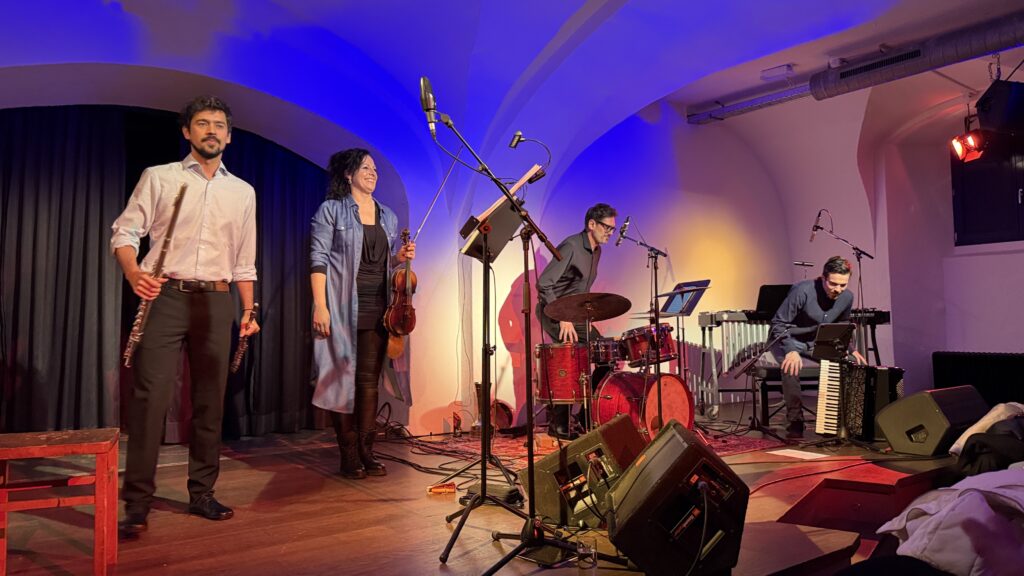 Das Quartett ist hochkarätig besetzt: Monica Tarcsay (Violine) überzeugte mit ausdrucksstarkem, warmem Ton, während der Kolumbianer und Wahl-Vorarlberger Juan Carlos Diaz an Querflöte und Altflöte für klangliche Vielfalt und feine Nuancierungen – auch mit zwei sehr schönen Eigenkompositionen und der Rezitation eines Gedichtes auf Spanisch und Deutsch sorgte. Raphael Brunner verlieh dem Ensemble am Akkordeon eine tragende, atmosphärische Tiefe, und Stefan Greussing setzte am Schlagwerk mit Schlagzeug und vielfältiger Perkussion rhythmische Akzente und dynamische Impulse.